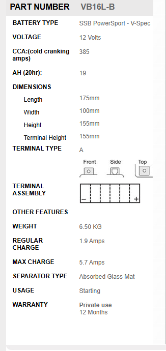 SSB V-Spec batteries are completely spill proof and leak proof and can be used upside down. They are also manufactured using Flame Retardant ABS Plastic making them one of the most versatile and safest motorcycle batteries in Australia.