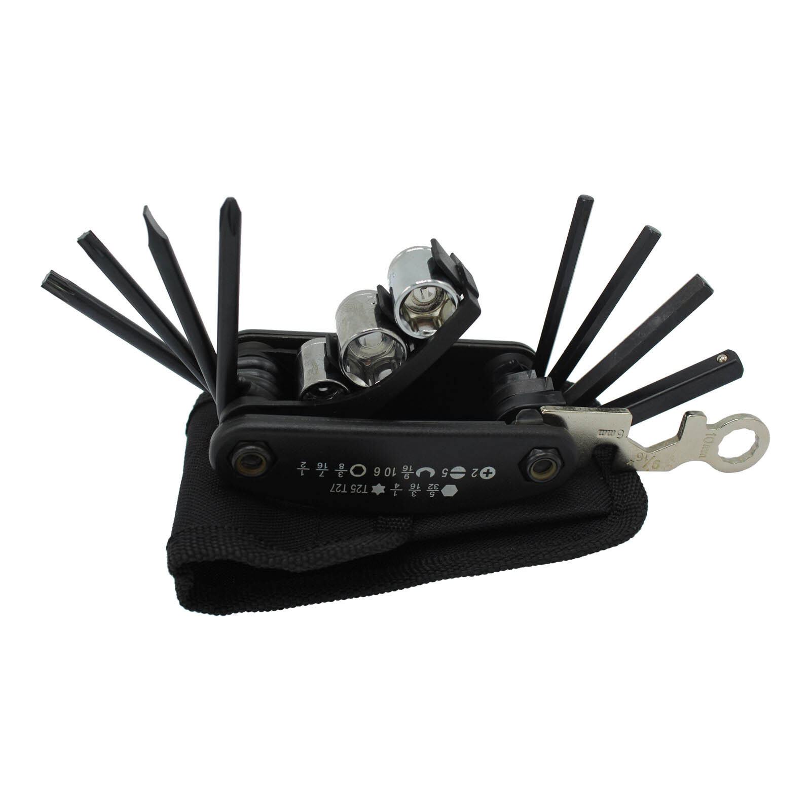 The Whites 14in1 Folding Motorcycle Tool Set is the perfect addition toyour underseat storage or hydration pack for emergency road or track siderepairs. The tool folds down to a convenient 90mm x 50mm x 30mm package andincludes a 1/4 drive socket bar that can be used with additional socketsfrom your socket set. Chrome vanadium sockets with hardened steel torx screwdrivers and hex keys are strong and durable and finished with acorrosion resistant black oxide coating. The tool has a black velcro bagincluded for quick and easy transportation and storage.