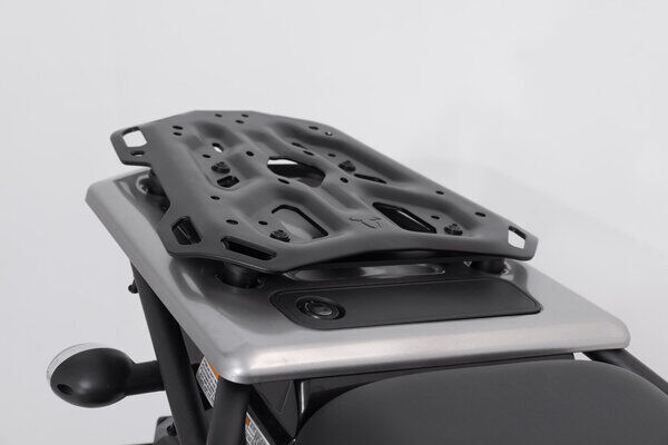 Ready for big adventure: Our ADVENTURE-RACK proves itself with its extreme durability and function-oriented shape. More than 15 years of experience producing racks, combined with feedback from customers and test riders, went into the development of this aluminum rack Material thickness, weight and geometry have been optimized for demanding tours and off-road use. The bike-specific attachments guarantee the best fit and easy mounting on original attachment points. Specifically developed for long-distance enduros, large street and sport touring machines, the ADVENTURE-RACK offers a large contact surface. Numerous, large lashing eyes provide secure hold for tail bags. The functional bores require adapter kits for attaching top cases by SW-MOTECH, Givi, Krauser and Shad or SysBags.