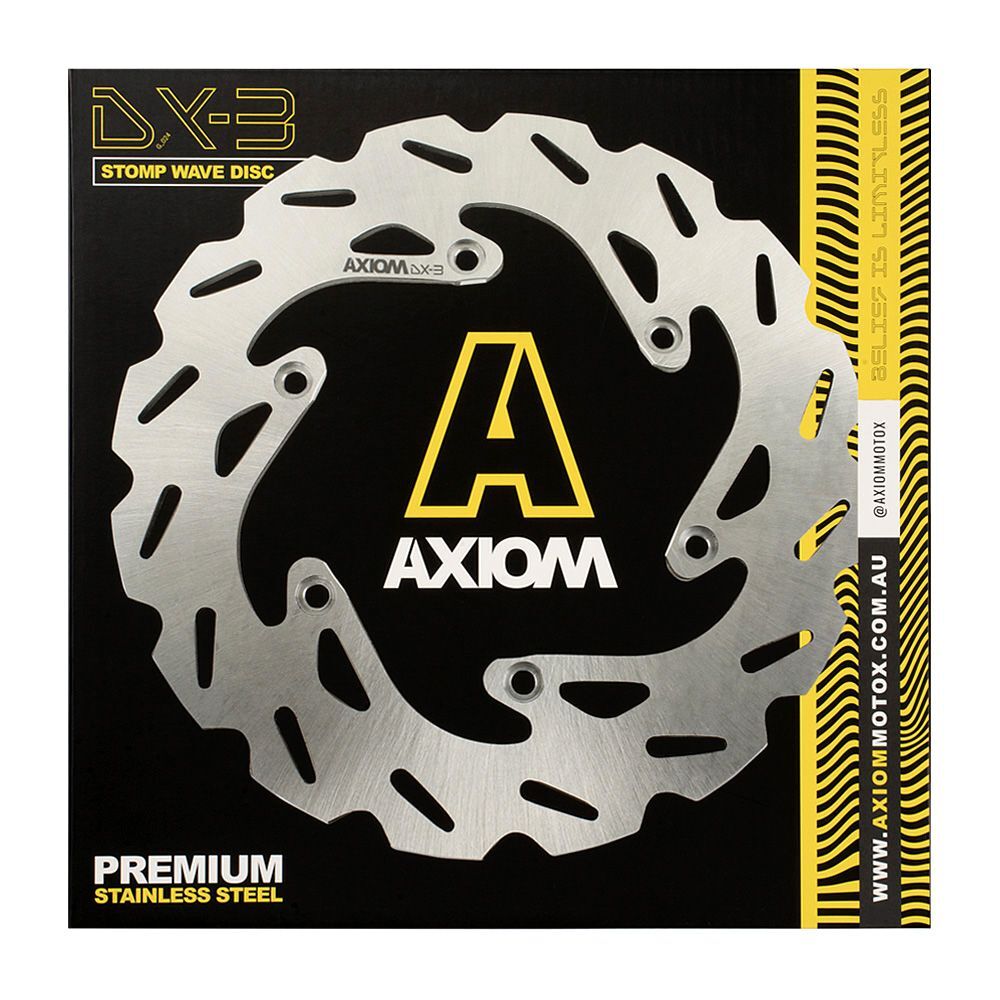 Axiom DX-3 Stomp Wave Discs are premium OEM size brake rotors developed for Motocross and off-road riding. The Stomp Wave rotor is for the rider that wants more than what the stock brake system can provide in extreme conditions.