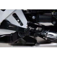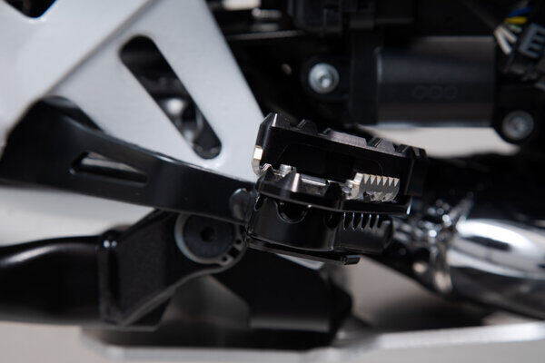 SW-MOTECH manufactures these extensions from high-strength milled aluminum alloy; they feature a black anodized surface and a stainless steel step plate. For optimal ergonomic adjustment, the increase in the brake pedal step can be adjusted in two stages of 22 or 27 millimeters.