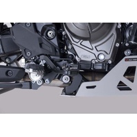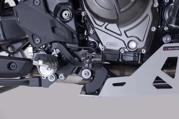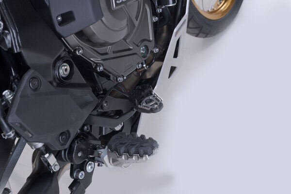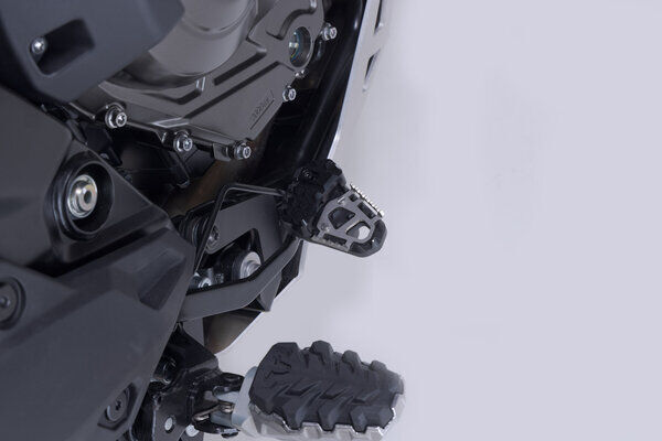 SW-MOTECH manufactures these extensions from high-strength milled aluminum alloy; they feature a black anodized surface and a stainless steel step plate. For optimal ergonomic adjustment, the increase in the brake pedal step can be adjusted in two stages of 22 or 27 millimeters.