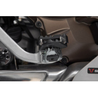 SW-MOTECH manufactures these extensions from high-strength milled aluminum alloy; they feature a black anodized surface and a stainless steel step plate. For optimal ergonomic adjustment, the increase in the brake pedal step can be adjusted in two stages of 22 or 27 millimeters.
