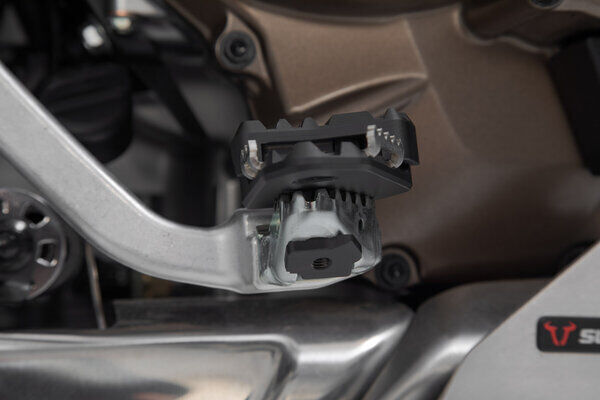 SW-MOTECH manufactures these extensions from high-strength milled aluminum alloy; they feature a black anodized surface and a stainless steel step plate. For optimal ergonomic adjustment, the increase in the brake pedal step can be adjusted in two stages of 22 or 27 millimeters.