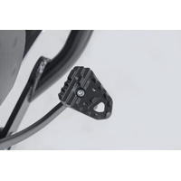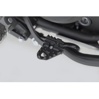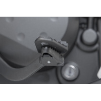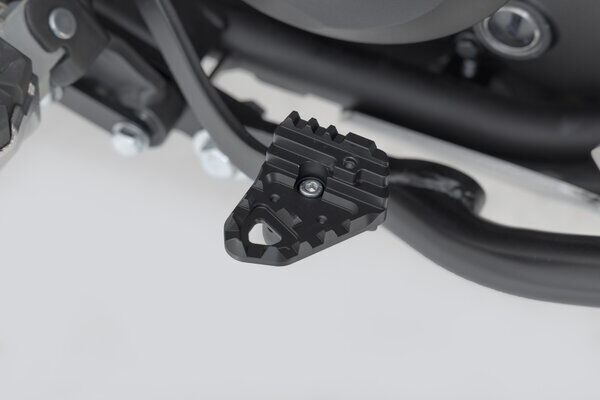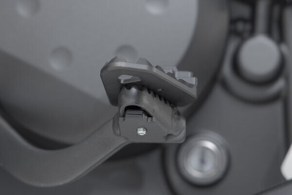 SW-MOTECH manufactures these extensions from high-strength milled aluminum alloy; they feature a black anodized surface and a stainless steel step plate. For optimal ergonomic adjustment, the increase in the brake pedal step can be adjusted in two stages of 22 or 27 millimeters.