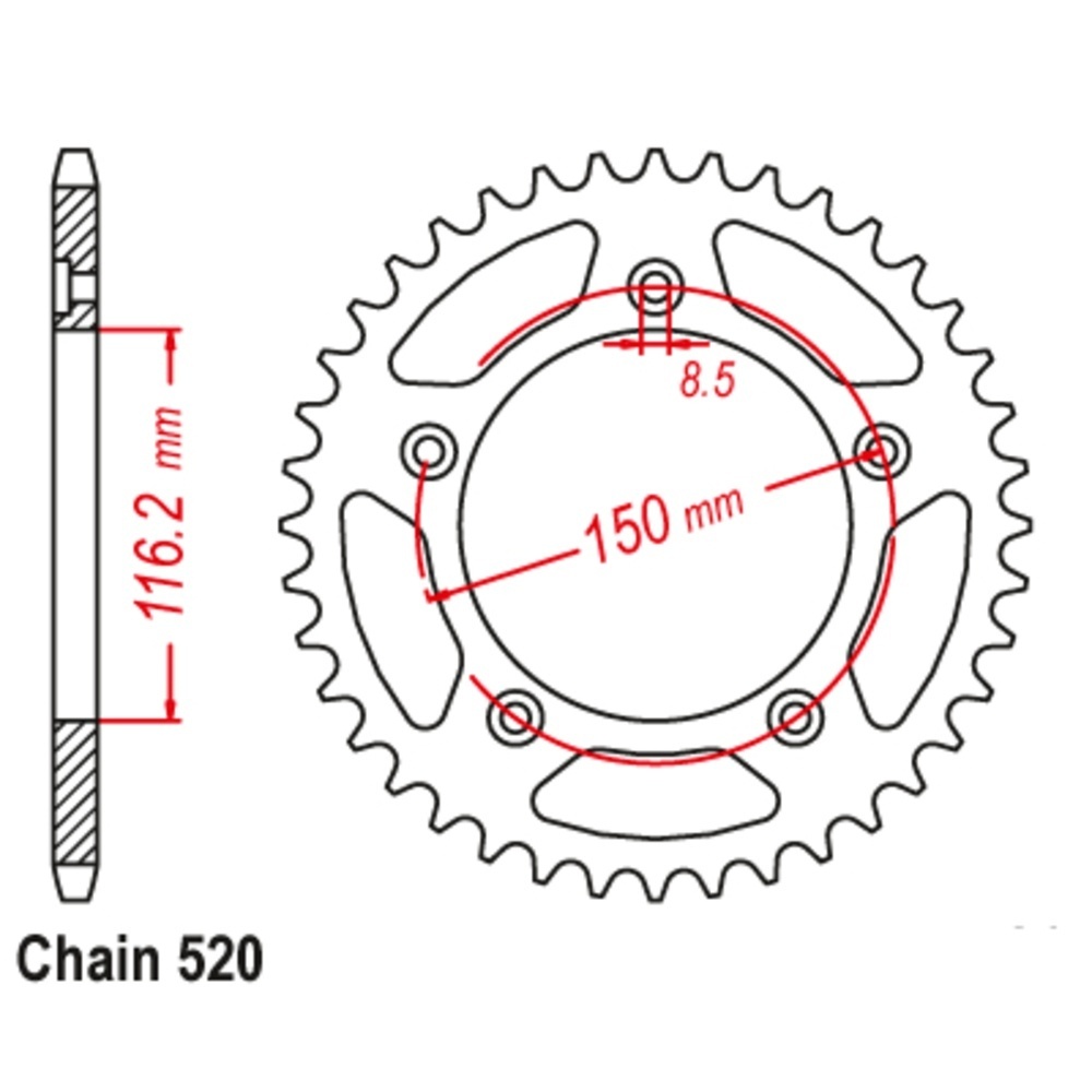 Check the specifications for sprocket teeth and chain size details.