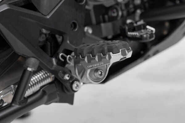 Is your original footrest impossible to position comfortably? Then the EVO footrest kit from SW-MOTECH is the perfect solution for you. This sophisticated system, consisting of rotating elements with firmly interlocking teeth, gives you 36 options for positioning. The position of the footrest can be adjusted so that it's lower or moved forwards or backwards as well as adjusted in terms of its angle to suit your individual needs. The bike-specific joint adapters are simply mounted on to the original parts of the footrest holder. We'll show you how this works in the mounting instructions.