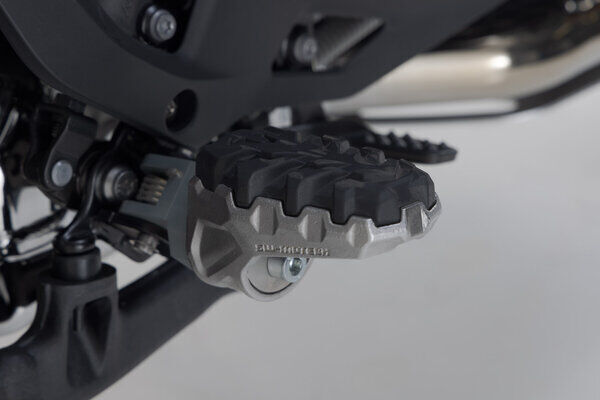 Is your original footrest impossible to position comfortably? Then the EVO footrest kit from SW-MOTECH is the perfect solution for you. This sophisticated system, consisting of rotating elements with firmly interlocking teeth, gives you 36 options for positioning. The position of the footrest can be adjusted so that it's lower or moved forwards or backwards as well as adjusted in terms of its angle to suit your individual needs. The bike-specific joint adapters are simply mounted on to the original parts of the footrest holder. We'll show you how this works in the mounting instructions.