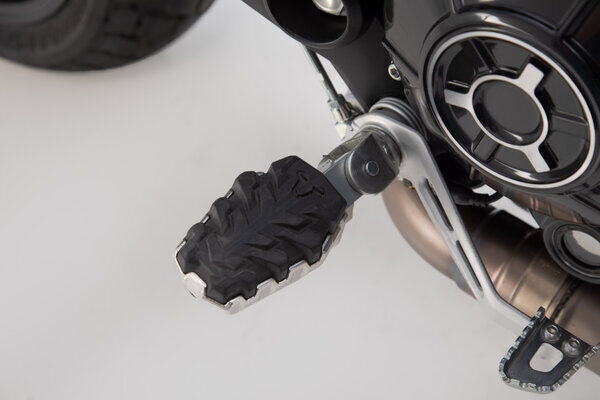 Is your original footrest impossible to position comfortably? Then the EVO footrest kit from SW-MOTECH is the perfect solution for you. This sophisticated system, consisting of rotating elements with firmly interlocking teeth, gives you 36 options for positioning. The position of the footrest can be adjusted so that it's lower or moved forwards or backwards as well as adjusted in terms of its angle to suit your individual needs. The bike-specific joint adapters are simply mounted on to the original parts of the footrest holder. We'll show you how this works in the mounting instructions.