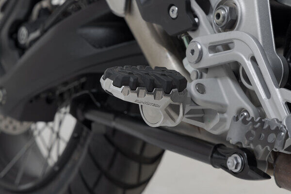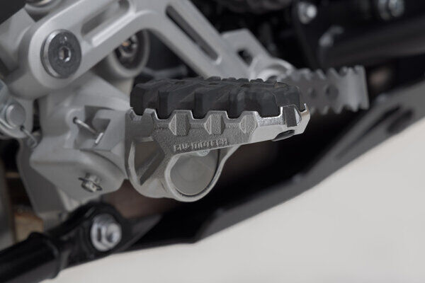 Is your original footrest impossible to position comfortably? Then the EVO footrest kit from SW-MOTECH is the perfect solution for you. This sophisticated system, consisting of rotating elements with firmly interlocking teeth, gives you 36 options for positioning. The position of the footrest can be adjusted so that it's lower or moved forwards or backwards as well as adjusted in terms of its angle to suit your individual needs. The bike-specific joint adapters are simply mounted on to the original parts of the footrest holder. We'll show you how this works in the mounting instructions.