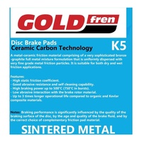 GOLDfren only manufacturers sintered brake pads that contain metal-ceramic and ceramic-carbon friction materials, these materials allow for less brake dust and a quieter braking experience. Sintered brake pads are made by fusing together metallic particles under high temperature and pressure which enhances friction properties and pad life, resulting in longer life and stronger braking. Sintered brake pads experience no brake fade when operating at high temperatures and in wet conditions. They also last up to 5 times longer than organic pads and provide additional braking strength. All materials used are environmentally friendly and do not contain any lead, asbestos, fibreglass or formaldehyde.