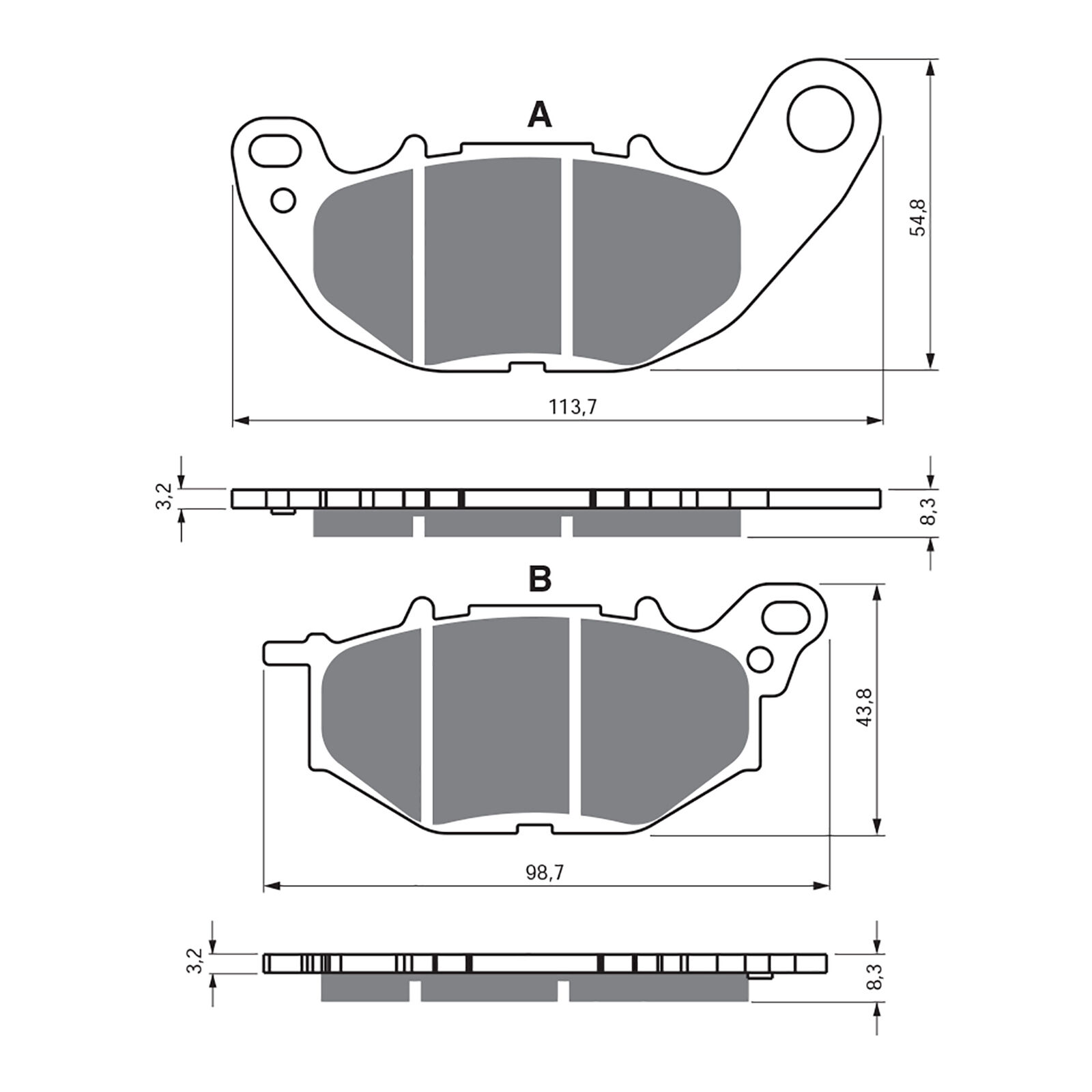 The S3 sintered compound is optimal in dry and wet conditions for road & off-road motorcycles. For the road application, S3 pads are suitable for both the front and rear brake while on off-road applications the S3 is only recommended for the front brake. The S3 series is designed for low abrasive interaction with the rotor and quieter braking due to the ceramic composite material. It has an HH friction rating and performs better at higher temperatures than the AD compound. Friction materials contain metal-ceramic with a bronze-graphite and non-metallic friction additives are spread evenly on the base fine bronze body to achieve optimal friction properties.