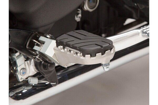 Our reasonably priced ION footrest kits allow the footrest to be mounted at its original height or lowered by 15 mm. Extremely durable and built to last, these stainless-steel footrests provide plenty of extra grip and are recommended for adventure, offroad and urban motorcycles. Hinges made from high-strength aluminum alloy ensure that the footrest can fold out of the way if the bike tips over. The removable rubber top surface reduces vibration, and the profile gives you a firm grip during offroad riding. To mount the bike-specific hinge adapter to the footrest sockets, the original attachments (springs, bolts, etc.) are used.