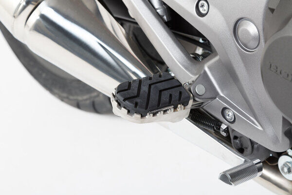 Our reasonably priced ION footrest kits allow the footrest to be mounted at its original height or lowered by 15 mm. Extremely durable and built to last, these stainless-steel footrests provide plenty of extra grip and are recommended for adventure, offroad and urban motorcycles. Hinges made from high-strength aluminum alloy ensure that the footrest can fold out of the way if the bike tips over. The removable rubber top surface reduces vibration, and the profile gives you a firm grip during offroad riding. To mount the bike-specific hinge adapter to the footrest sockets, the original attachments (springs, bolts, etc.) are used.
