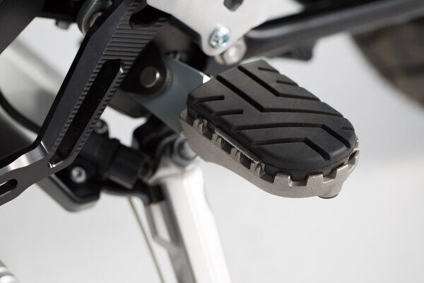 Our reasonably priced ION footrest kits allow the footrest to be mounted at its original height or lowered by 15 mm. Extremely durable and built to last, these stainless-steel footrests provide plenty of extra grip and are recommended for adventure, offroad and urban motorcycles. Hinges made from high-strength aluminum alloy ensure that the footrest can fold out of the way if the bike tips over. The removable rubber top surface reduces vibration, and the profile gives you a firm grip during offroad riding. To mount the bike-specific hinge adapter to the footrest sockets, the original attachments (springs, bolts, etc.) are used.