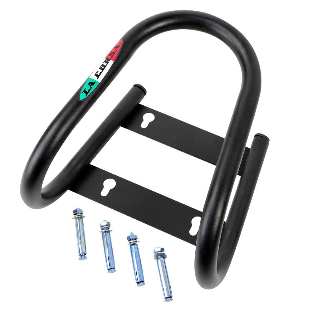 • The La Corsa 25mm Motorcycle Wheel Chock is a durable, V-shaped steel tube stand designed for securing, transporting, or storing motorcycles. It features a 130mm maximum tire width capacity, weighs 1.3kg, and includes mounting bolts for van or trailer installation