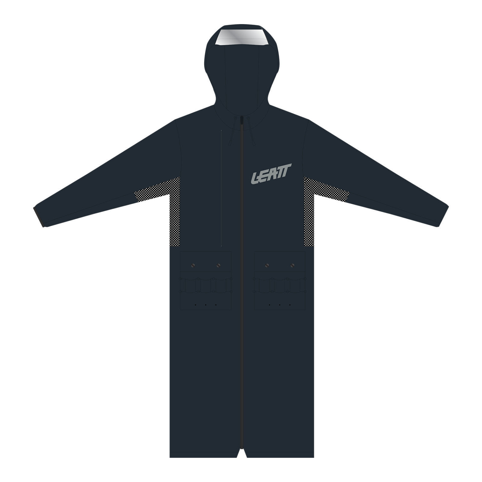 This extra-long coat is made from a soft waterproof material and has pockets on the front as well as loops for holding T-shaped tools.