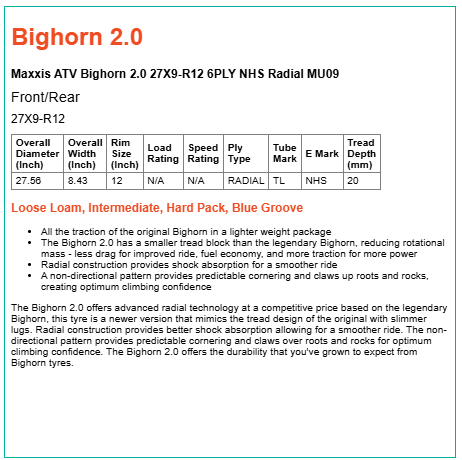 • The Bighorn 2.0 has a smaller tread block than the legendary Bighorn, reducing rotational mass - less drag for improved ride, fuel economy, and more traction for more power