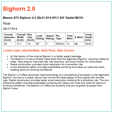 • The Bighorn 2.0 has a smaller tread block than the legendary Bighorn, reducing rotational mass - less drag for improved ride, fuel economy, and more traction for more power