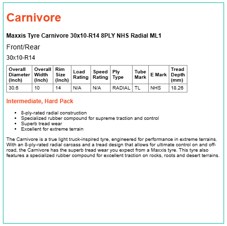 The Maxxis Carnivore is a state-of-the-art all-terrain ATV tyre engineered to perform in harsh and formidable terrains.
