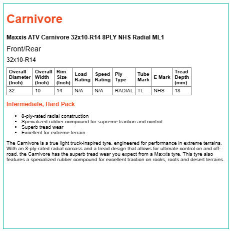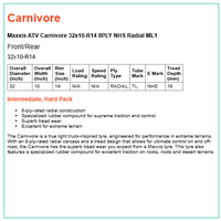 The Maxxis Carnivore is a state-of-the-art all-terrain ATV tyre engineered to perform in harsh and formidable terrains.