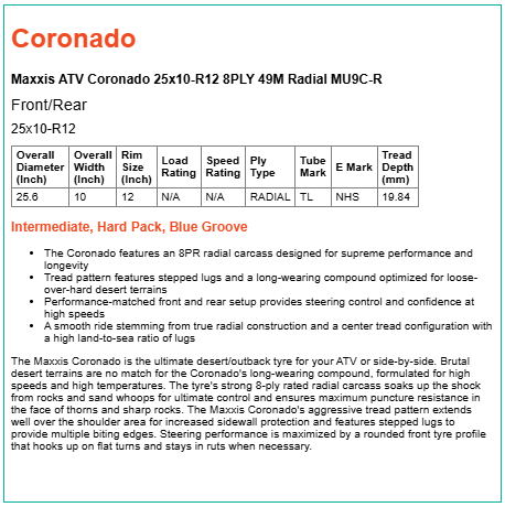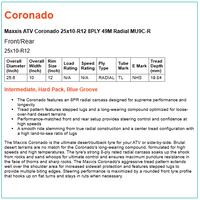 The Maxxis Coronado is the ultimate desert/outback tyre for your ATV or side-by-side. Brutal desert terrains are no match for the Coronado's long-wearing compound, formulated for high speeds and high temperatures. The tyre's strong 8-ply rated radial carcass soaks up the shock from rocks and sand whoops for ultimate control and ensures maximum puncture resistance in the face of thorns and sharp rocks. The Maxxis Coronado's aggressive tread pattern extends well over the shoulder area for increased sidewall protection and features stepped lugs to provide multiple biting edges. Steering performance is maximized by a rounded front tyre profile that hooks up on flat turns and stays in ruts when necessary.