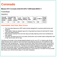 The Maxxis Coronado is the ultimate desert/outback tyre for your ATV or side-by-side. Brutal desert terrains are no match for the Coronado's long-wearing compound, formulated for high speeds and high temperatures. The tyre's strong 8-ply rated radial carcass soaks up the shock from rocks and sand whoops for ultimate control and ensures maximum puncture resistance in the face of thorns and sharp rocks. The Maxxis Coronado's aggressive tread pattern extends well over the shoulder area for increased sidewall protection and features stepped lugs to provide multiple biting edges. Steering performance is maximized by a rounded front tyre profile that hooks up on flat turns and stays in ruts when necessary.