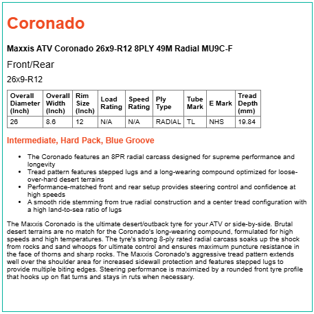 The Maxxis Coronado is the ultimate desert/outback tyre for your ATV or side-by-side. Brutal desert terrains are no match for the Coronado's long-wearing compound, formulated for high speeds and high temperatures. The tyre's strong 8-ply rated radial carcass soaks up the shock from rocks and sand whoops for ultimate control and ensures maximum puncture resistance in the face of thorns and sharp rocks. The Maxxis Coronado's aggressive tread pattern extends well over the shoulder area for increased sidewall protection and features stepped lugs to provide multiple biting edges. Steering performance is maximized by a rounded front tyre profile that hooks up on flat turns and stays in ruts when necessary.