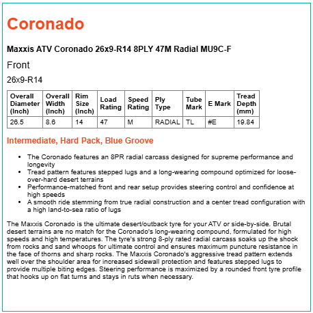 The Maxxis Coronado is the ultimate desert/outback tyre for your ATV or side-by-side. Brutal desert terrains are no match for the Coronado's long-wearing compound, formulated for high speeds and high temperatures. The tyre's strong 8-ply rated radial carcass soaks up the shock from rocks and sand whoops for ultimate control and ensures maximum puncture resistance in the face of thorns and sharp rocks. The Maxxis Coronado's aggressive tread pattern extends well over the shoulder area for increased sidewall protection and features stepped lugs to provide multiple biting edges. Steering performance is maximized by a rounded front tyre profile that hooks up on flat turns and stays in ruts when necessary.