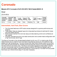 The Maxxis Coronado is the ultimate desert/outback tyre for your ATV or side-by-side. Brutal desert terrains are no match for the Coronado's long-wearing compound, formulated for high speeds and high temperatures. The tyre's strong 8-ply rated radial carcass soaks up the shock from rocks and sand whoops for ultimate control and ensures maximum puncture resistance in the face of thorns and sharp rocks. The Maxxis Coronado's aggressive tread pattern extends well over the shoulder area for increased sidewall protection and features stepped lugs to provide multiple biting edges. Steering performance is maximized by a rounded front tyre profile that hooks up on flat turns and stays in ruts when necessary.