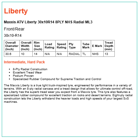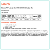 The Maxxis Liberty is a true light truck-inspired tyre, engineered for performance in a variety of terrains. With an 8-ply radial carcass and a tread design that allows for ultimate control off-road, the Liberty has the superb tread wear you expect from a Maxxis tyre. This tyre also features a specialized rubber compound for excellent traction on rocks and desert terrains. Eight-ply radial construction lets the Liberty withstand the heavier loads and high speeds of your largest SxS machines.
