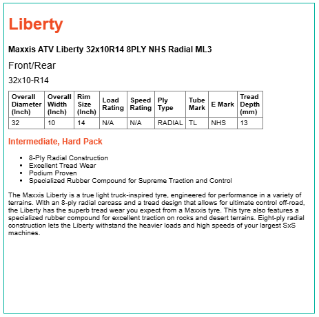 The Maxxis Liberty is a true light truck-inspired tyre, engineered for performance in a variety of terrains. With an 8-ply radial carcass and a tread design that allows for ultimate control off-road, the Liberty has the superb tread wear you expect from a Maxxis tyre. This tyre also features a specialized rubber compound for excellent traction on rocks and desert terrains. Eight-ply radial construction lets the Liberty withstand the heavier loads and high speeds of your largest SxS machines.
