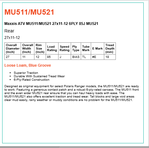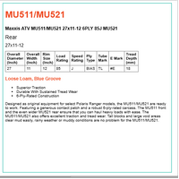 Designed as original equipment for select Polaris Ranger models, the MU511/MU521 are ready to work. Featuring a generous contact patch and a robust 6-ply-rated carcass. The MU511 front and the even wider MU521 rear ensure that you can haul heavy loads with ease. The MU511/MU521 also offers excellent traction and tread wear. Tall blocks and large void areas clear mud easily, rainy weather or muddy conditions are no problem for the MU511/MU521.