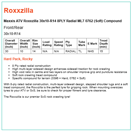 With 8-ply rated radial construction, multi-layer sidewall design, stepped shoulder lugs and a soft tread compound, the Roxxzilla is the perfect tyre for gripping rock. When mounting oversizes tyres to your ATV or SxS, be sure to check for proper fitment and tyre clearance.
