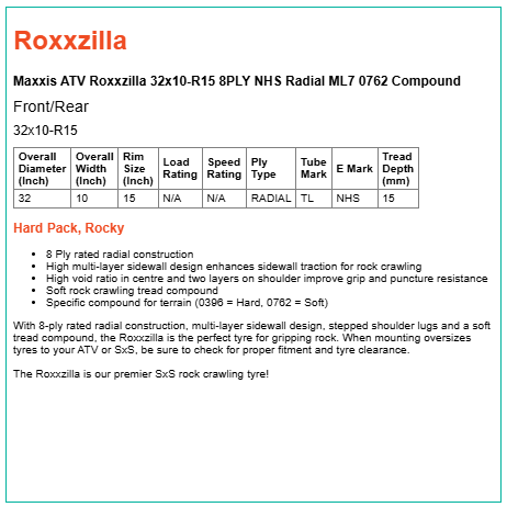 With 8-ply rated radial construction, multi-layer sidewall design, stepped shoulder lugs and a soft tread compound, the Roxxzilla is the perfect tyre for gripping rock. When mounting oversizes tyres to your ATV or SxS, be sure to check for proper fitment and tyre clearance.