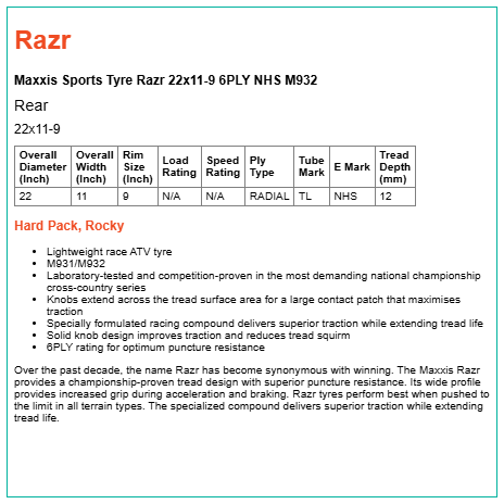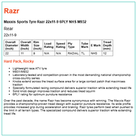 Over the past decade, the name Razr has become synonymous with winning. The Maxxis Razr provides a championship-proven tread design with superior puncture resistance. Its wide profile provides increased grip during acceleration and braking. Razr tyres perform best when pushed to the limit in all terrain types. The specialized compound delivers superior traction while extending tread life.
