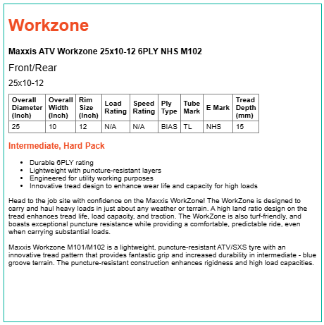 Maxxis Workzone M101/M102 is a lightweight, puncture-resistant ATV/SXS tyre with an innovative tread pattern that provides fantastic grip and increased durability in intermediate - blue groove terrain. The puncture-resistant construction enhances rigidness and high load capacities.