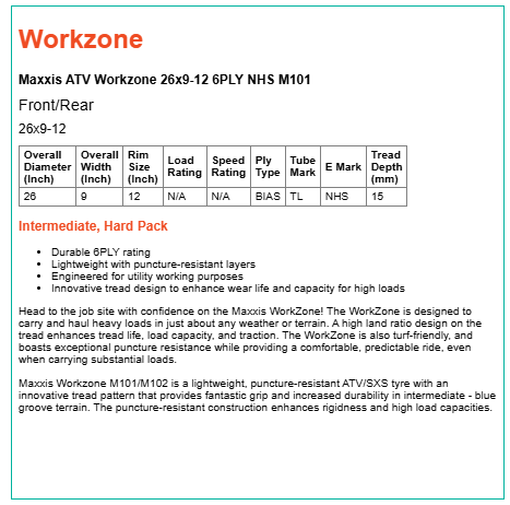 Maxxis Workzone M101/M102 is a lightweight, puncture-resistant ATV/SXS tyre with an innovative tread pattern that provides fantastic grip and increased durability in intermediate - blue groove terrain. The puncture-resistant construction enhances rigidness and high load capacities.