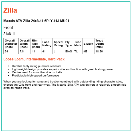 When you are looking for value and traction combined with outstanding riding characteristics, choose the 'Zilla front and rear tyres. The Maxxis 'Zilla ATV tyre delivers a relatively smooth ride even on rough trails.