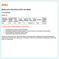 When you are looking for value and traction combined with outstanding riding characteristics, choose the 'Zilla front and rear tyres. The Maxxis 'Zilla ATV tyre delivers a relatively smooth ride even on rough trails.