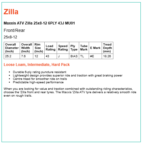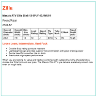When you are looking for value and traction combined with outstanding riding characteristics, choose the 'Zilla front and rear tyres. The Maxxis 'Zilla ATV tyre delivers a relatively smooth ride even on rough trails.