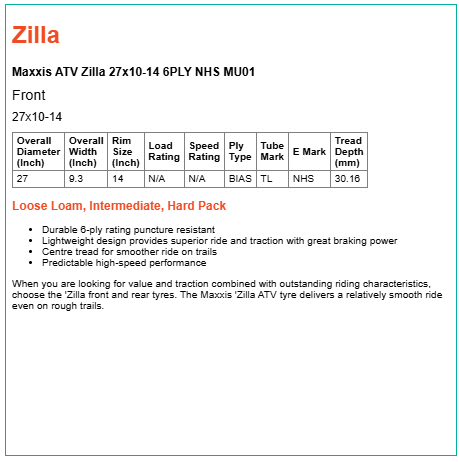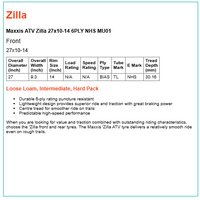 When you are looking for value and traction combined with outstanding riding characteristics, choose the 'Zilla front and rear tyres. The Maxxis 'Zilla ATV tyre delivers a relatively smooth ride even on rough trails.