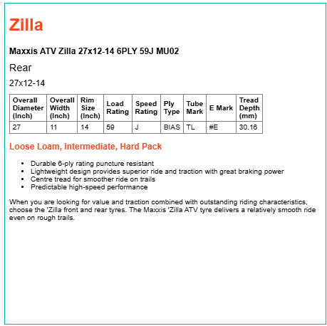 When you are looking for value and traction combined with outstanding riding characteristics, choose the 'Zilla front and rear tyres. The Maxxis 'Zilla ATV tyre delivers a relatively smooth ride even on rough trails.