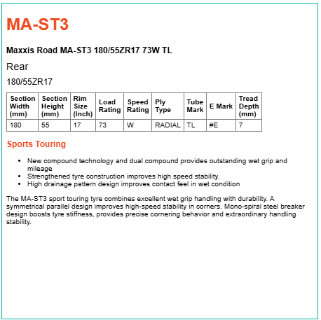 The new MA-ST3 delivers superior traction, stability, and ride comfort across diverse road conditions. Its advanced tread pattern enhances wet and dry grip, ensuring a smooth and confident driving experience. Built for longevity and optimal handling, the MA-ST3 is perfect for riders seeking top-tier performance without compromise. Whether you’re navigating city streets or exploring open highways, the MA-ST3 provides the ultimate balance of safety and performance.