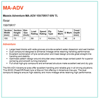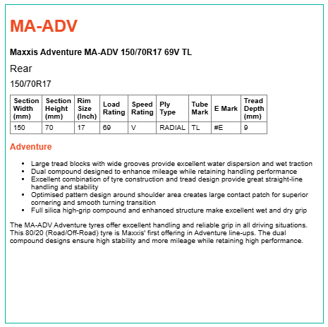• The MA-ADV Adventure tyres offer excellent handling and reliable grip in all driving situations. This 80/20 (Road/Off-Road) tyre is Maxxis' first offering in Adventure line-ups. The dual compound designs ensure high stability and more mileage while retaining high performance.