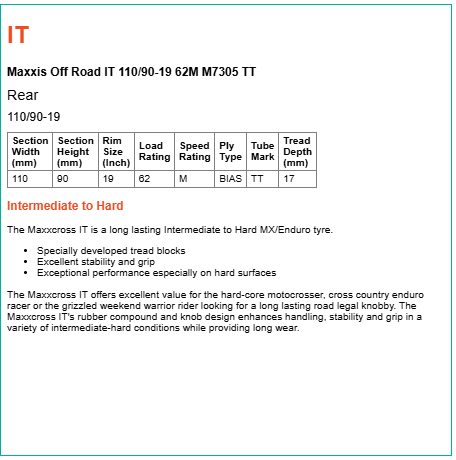 The Maxxcross IT offers excellent value for the hard-core motocrosser, cross country enduro racer or the grizzled weekend warrior rider looking for a long lasting road legal knobby. The Maxxcross IT's rubber compound and knob design enhances handling, stability and grip in a variety of intermediate-hard conditions while providing long wear.