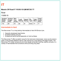 The Maxxcross IT is a long lasting Intermediate to Hard MX/Enduro tyre.