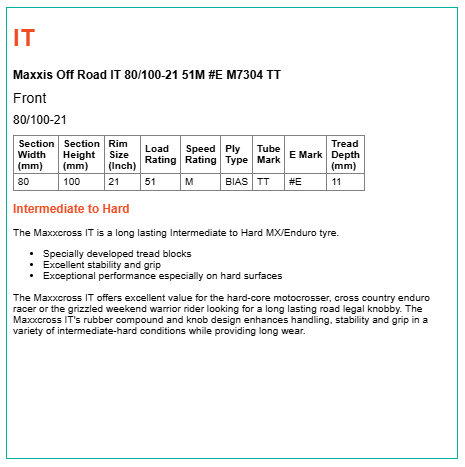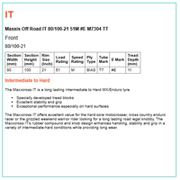 The Maxxcross IT offers excellent value for the hard-core motocrosser, cross country enduro racer or the grizzled weekend warrior rider looking for a long lasting road legal knobby. The Maxxcross IT's rubber compound and knob design enhances handling, stability and grip in a variety of intermediate-hard conditions while providing long wear.