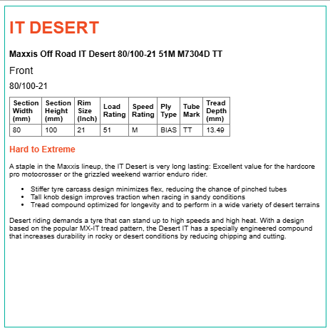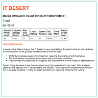 The Maxxcross IT offers excellent value for the hard-core motocrosser, cross country enduro racer or the grizzled weekend warrior rider looking for a long lasting road legal knobby. The Maxxcross IT's rubber compound and knob design enhances handling, stability and grip in a variety of intermediate-hard conditions while providing long wear.