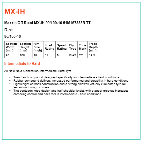 • The pentagon knob design and half-shoulder knobs with stagger grooves increases cornering control and rider feel in intermediate - hard conditions